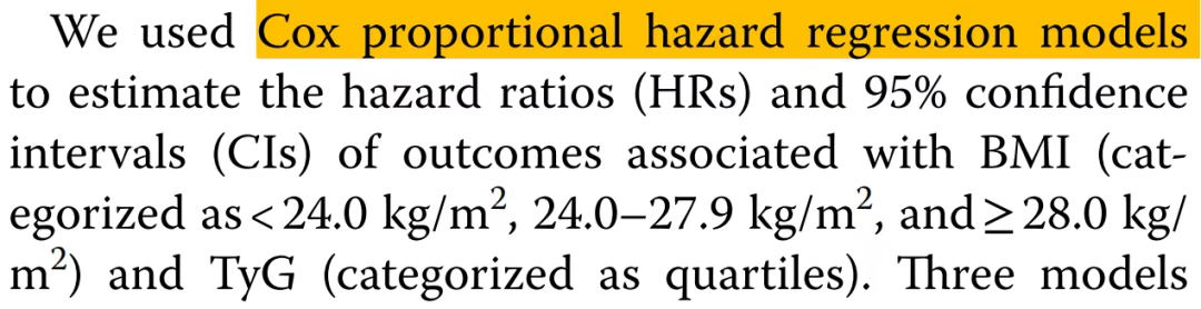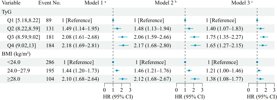 使用Cox比例风险回归模型来估计与BMI(分为<24.0 kg/m2、24.0-27.9 kg/m2,≥28.0kg/m2)和TyG(分为四分位数)相关的结果的风险比(HRs)和95%可信区间(CI)。
