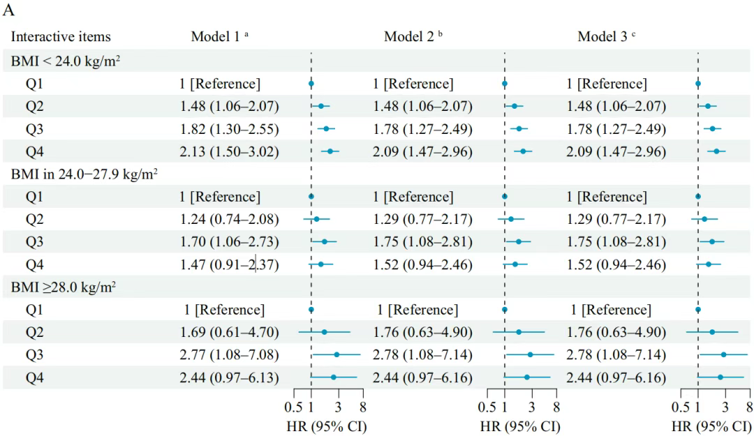 通过比较BMI≥28.0 kg/m2和BMI<24.0 kg/m2,调整后卒中的HRs=1.38(95% CI ,1.08–1.77);