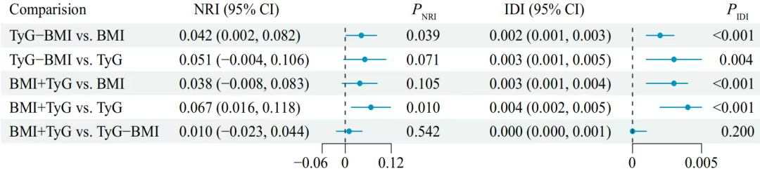 (3)值得注意的是,BMI+TyG指数与个体BMI和TyG指数有显著差异。