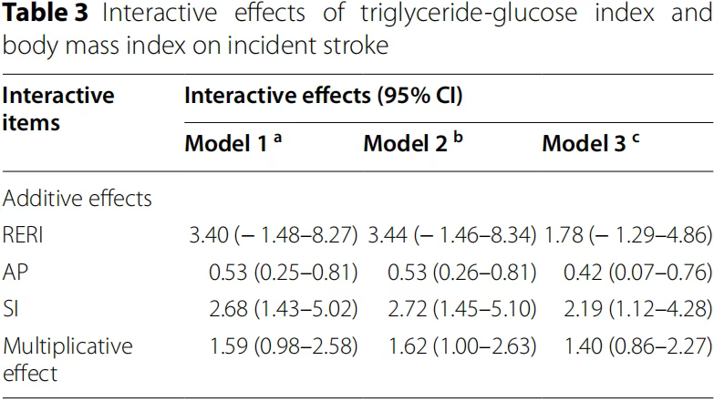 在卒中事件中,BMI和TyG之间没有发现显著的乘法和加法交互作用。
