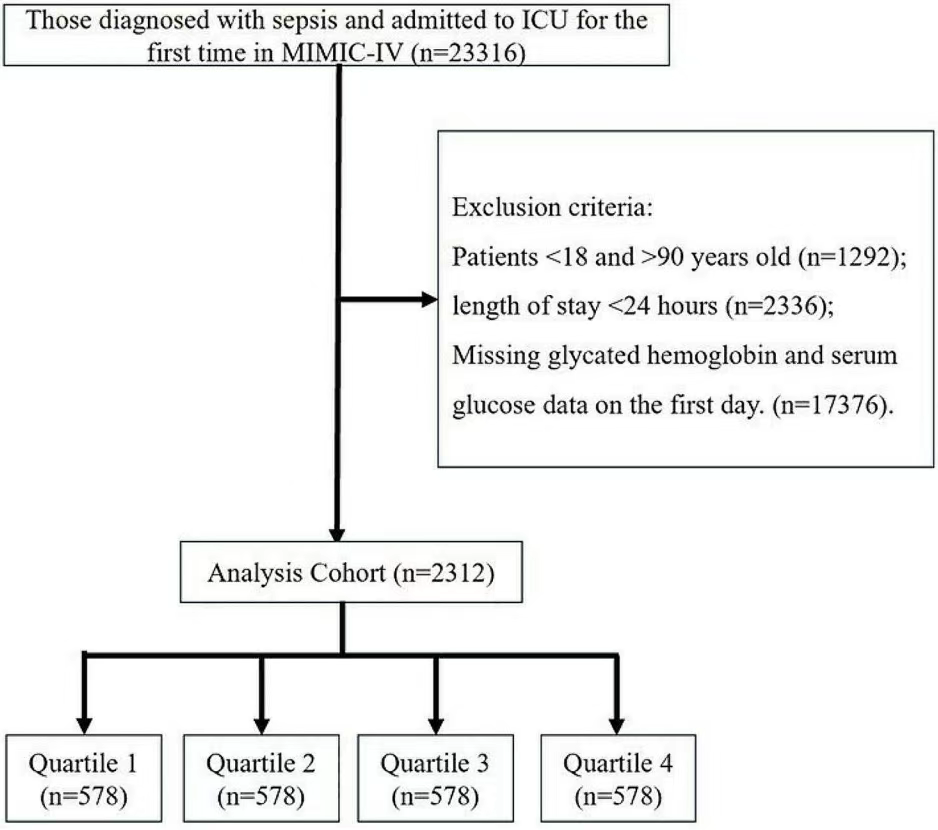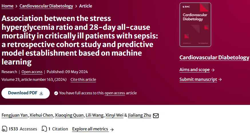 2024年5月9日,暨南大学的学者用MIMIC-IV 数据库,在期刊《Cardiovascular Diabetology》(医学一区top,IF=8.5)发表题为:“Association between the stress hyperglycemia ratio and 28-day all-cause mortality in critically ill patients with sepsis: a retrospective cohort study and predictive model establishment based on machine learning ”的研究论文,旨在探讨应激性高血糖比(SHR)与脓毒症危重患者不良结局之间的关联。
