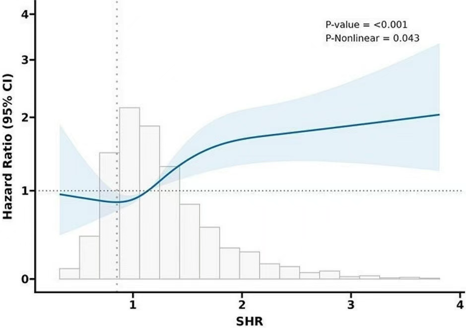 在随后的RCS分析中,研究团队根据混杂因素进行了调整。研究结果与主要分析结果一致,均表明SHR与死亡风险之间存在U型关联。