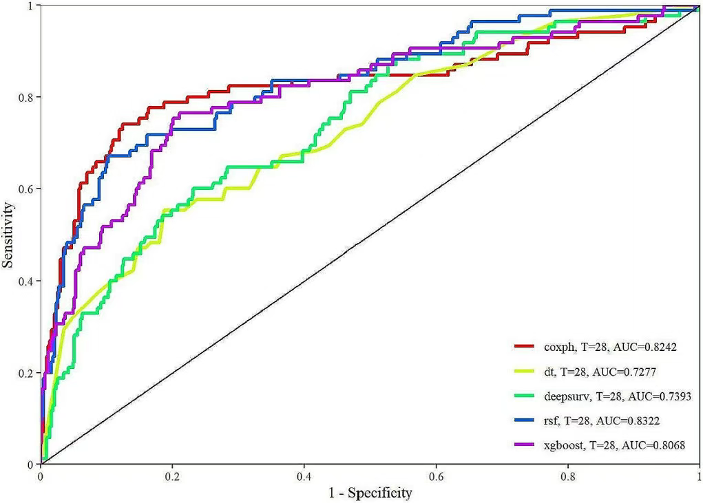 进一步使用机器学习算法建立预测模型,将变量SHR纳入各种机器学习算法,结果表明这些预测模型都表现出良好的性能,其中rsf算法构建的模型表现最佳(AUC=0.8322)。