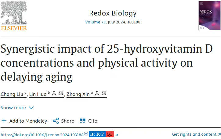 2024年7月,首都医科大学的学者用NHANES数据库,在期刊《Redox Biology》(医学一区top,IF=10.7)发表题为:“Synergistic impact of 25-hydroxyvitamin D concentrations and physical activity on delaying aging”的研究论文,旨在探究血清25-羟基维生素D [25(OH)D]浓度和体力活动(PA)状态与衰老表型年龄(PhenoAge)的独立和联合关联。