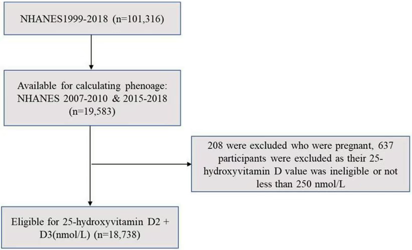 在该项研究中,研究团队使用了美国国家健康和营养调查(NHANES)2007-2010年和2015-2018年的数据,加权平均(SE)年龄为47.8(0.2)岁,49.09%为男性。主要使用加权多变量Logistic回归模型分析了血清25(OH)D水平和运动对表型年龄(PhenoAge)的影响。