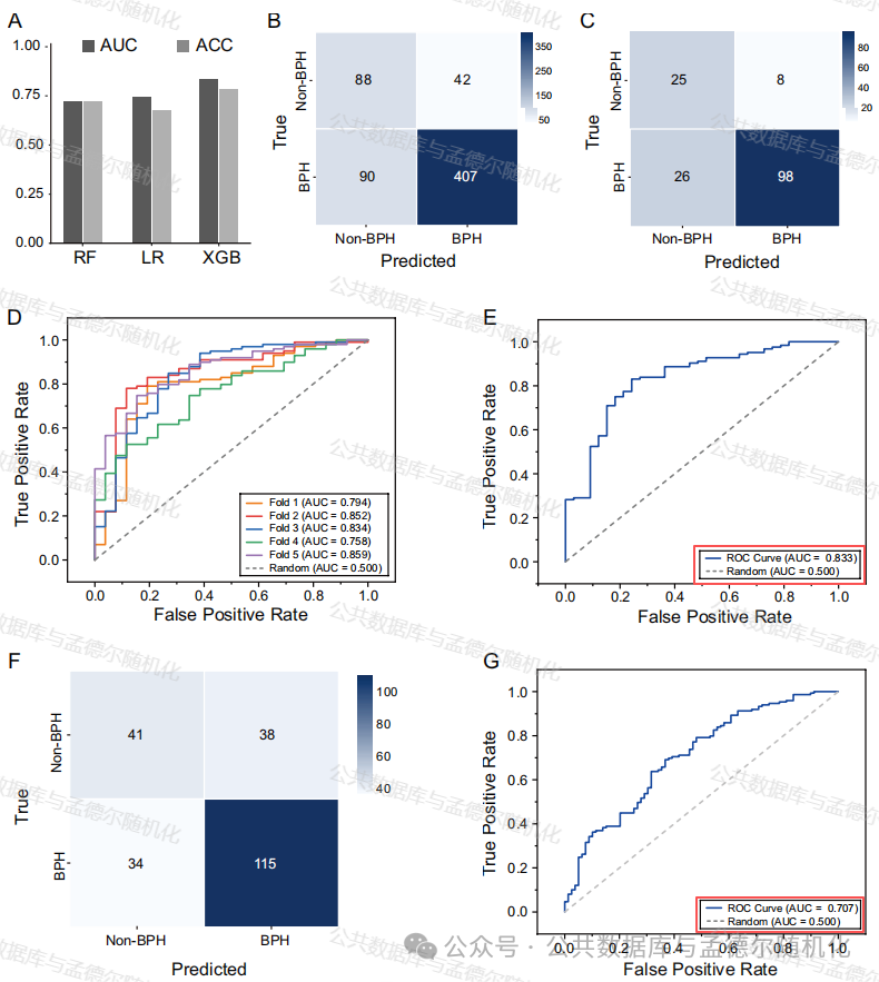 在构建预测模型方面,研究通过递归特征消除 (RFE)筛选与BPH相关的特征,构建并比较多种机器学习模型(随机森林、Logistic回归XGBoost)预测性能,并利用SHAP值进行特征重要性解释。