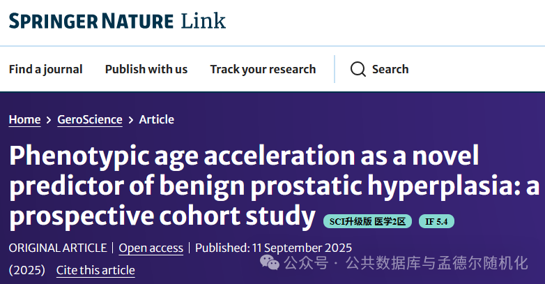 2025年9月11日,北京协和医学院学者用NHANES数据库,在期刊《Geroscience》(医学二区,IF=5.4)发表了一篇题为:“Phenotypic age acceleration as a novel predictor of benign prostatic hyperplasia: a prospective cohort study”的研究论文,旨在探究表型年龄和表型年龄加速对良性前列腺增生(BPH)的预测价值,并开发一个基于机器学习的风险预测模型,为精准预防和临床管理策略提供信息。