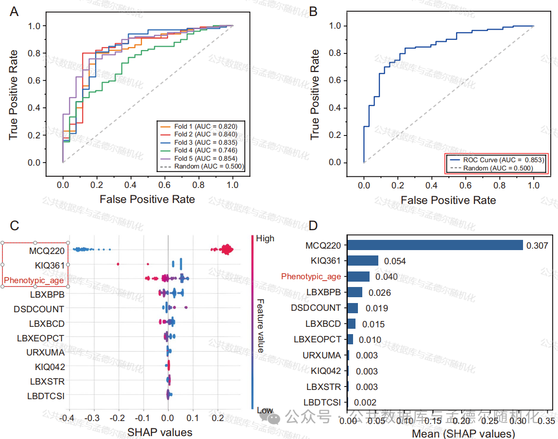 此外,SHAP分析显示,表型年龄是第三重要的预测因子,仅次于癌症史和铅暴露。