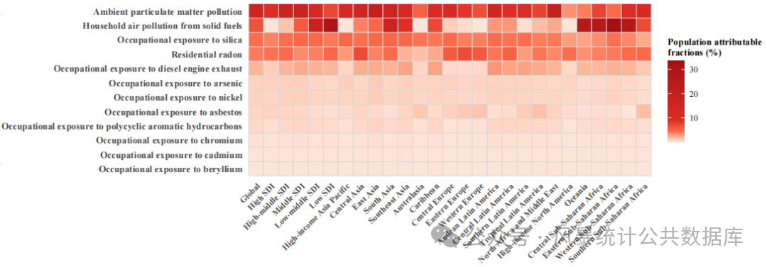 风险因素热图:展示的是各地区某一年的某个特定风险因素(如吸烟、高血压、PM2.5暴露等)在总体疾病负担中所占的比例(即人口归因分数PAF)排名情况;