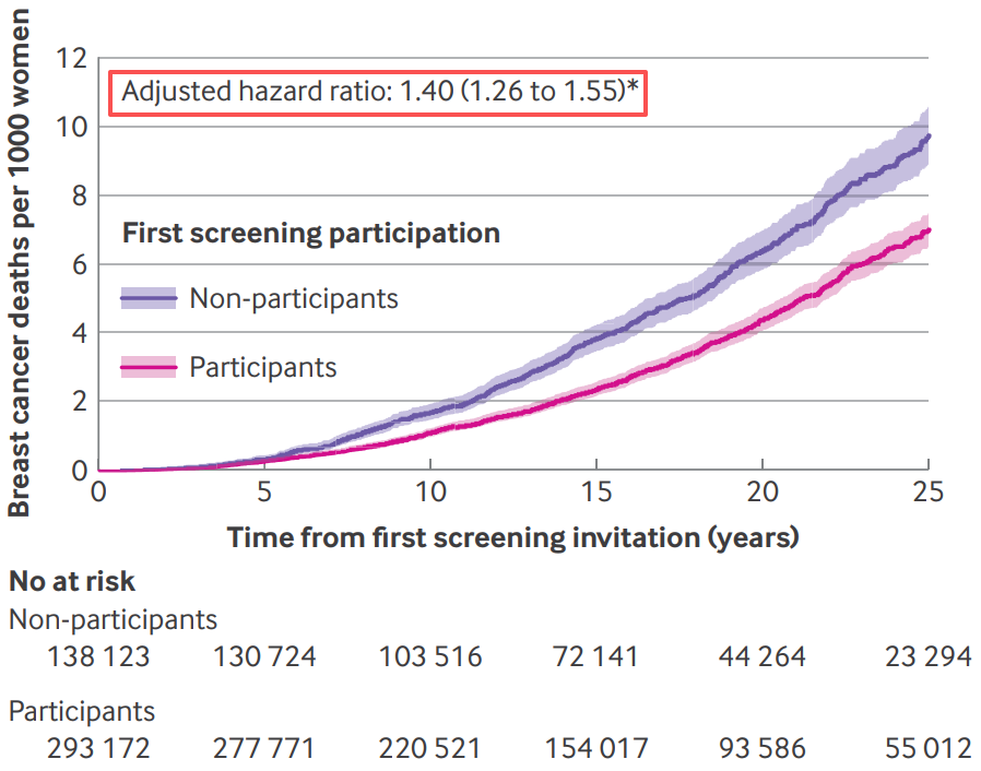 相比之下,25年乳腺癌发生率在两组间相似(参与者7.8% 对 未参加者7.6%),提示首次筛查缺席者较高的死亡率很可能反映的是检测延迟导致的病情更晚期被诊断,而非发病率增加。