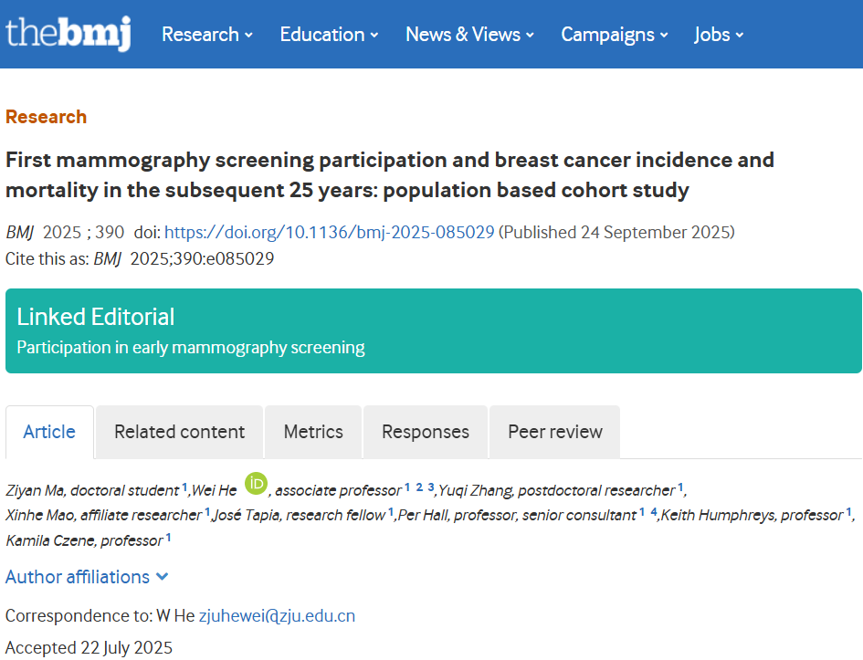 2025年9月24日,浙江大学何威副教授研究团队在医学顶刊《BMJ》杂志发表最新研究。分析超 43 万名女性,最长随访至 25 年的数据,结论直击核心:首次乳腺癌筛查缺席的女性,后来更常因为症状才被发现、分期更晚、25 年乳腺癌死亡风险显著更高。