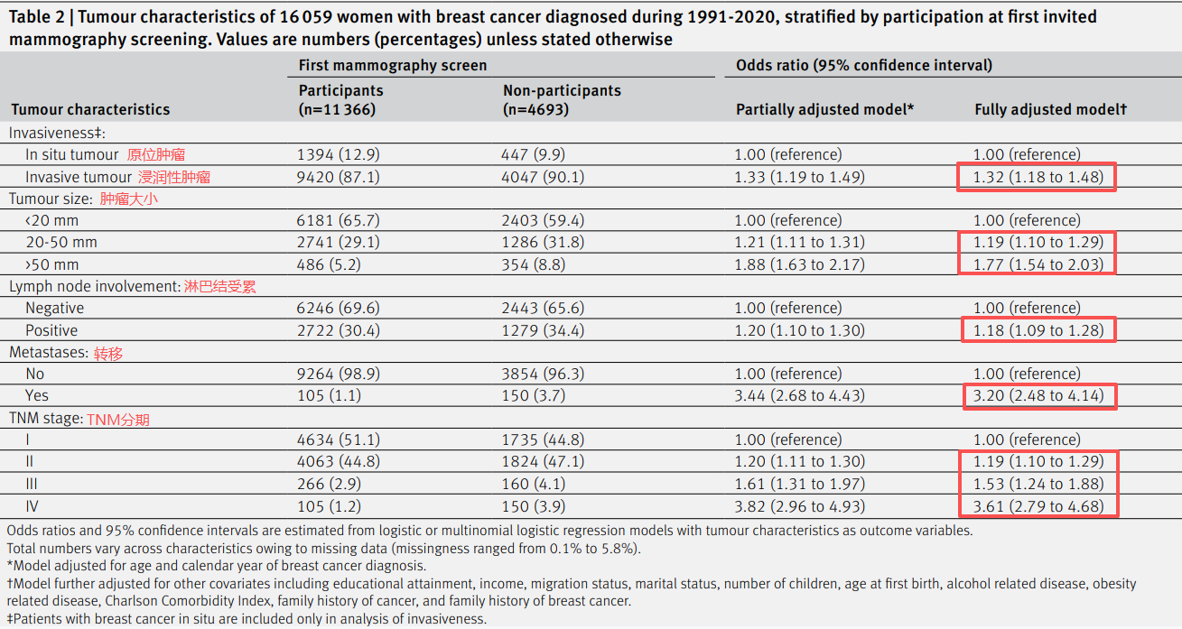 在发生乳腺癌的女性中,多变量调整模型显示,首次筛查未参加与更高的浸润性几率相关,并与更晚期分期相关。