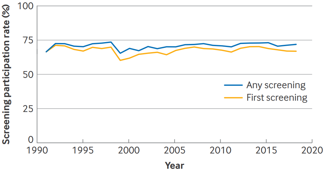 研究表明,首次筛查的参与率在历年间未见显著变化。