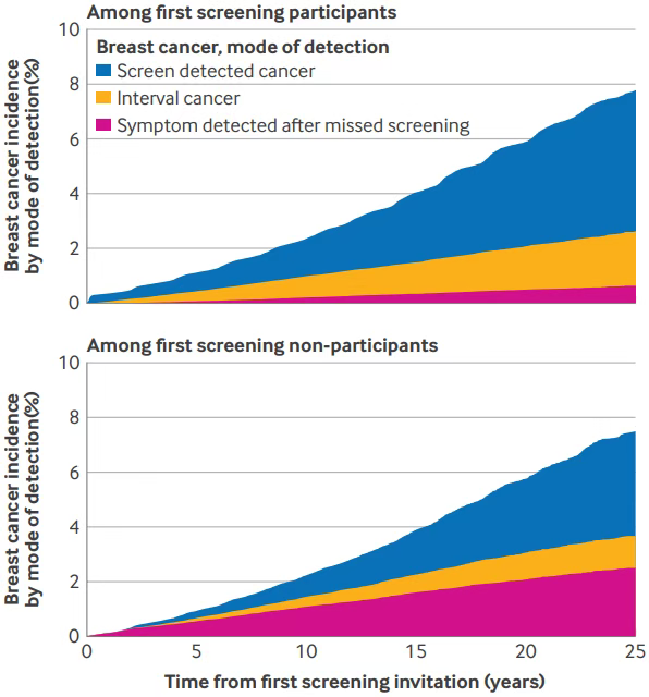 首次筛查参与者与未参加者的25年累积乳腺癌发病率无显著差异。然而,发现方式明显不同:首次筛查缺席者在错过筛查后出现症状而检测到的癌症的可能性要大得多(2.6% vs0.7%)。