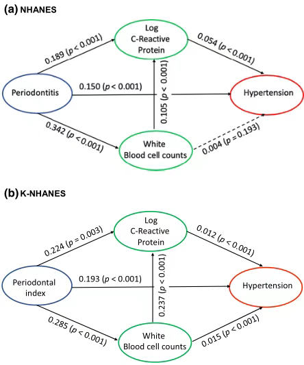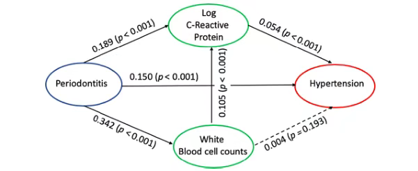 全身炎症C反应蛋白和白细胞计数在牙周炎和高血压中介作用。