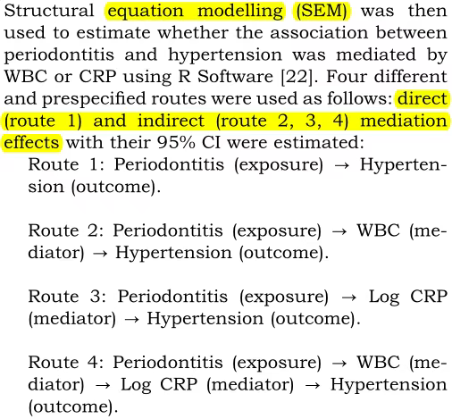5.结构方程模型分析中介效应,使用结构方程模型 (SEM) 来估计牙周炎和高血压之间的关联是否由使用 R 软件的 WBC 或 CRP 介导 。使用以下四种不同的和预先指定的途径:直接(途径 1)和间接(途径 2、3、4)中介效应及其 95% CI 。