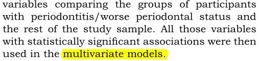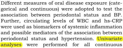 2.先单后多logistics回归,本研究采用不同的口腔疾病暴露测量指标(分类和连续),以测试牙周状况与血压之间的关联。此外,WBC和hs-CRP水平被用作系统性炎症的生物标志物,可能也是牙周状况和高血压之间关联的中介因素。进行单因素分析,比较患有牙周炎/更糟糕牙周状况组和研究样本其余部分的所有连续变量。所有具有统计学差异的变量随后纳入多因素模型中。