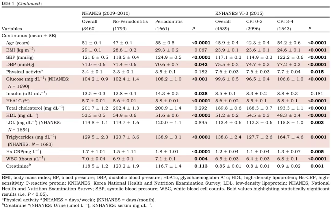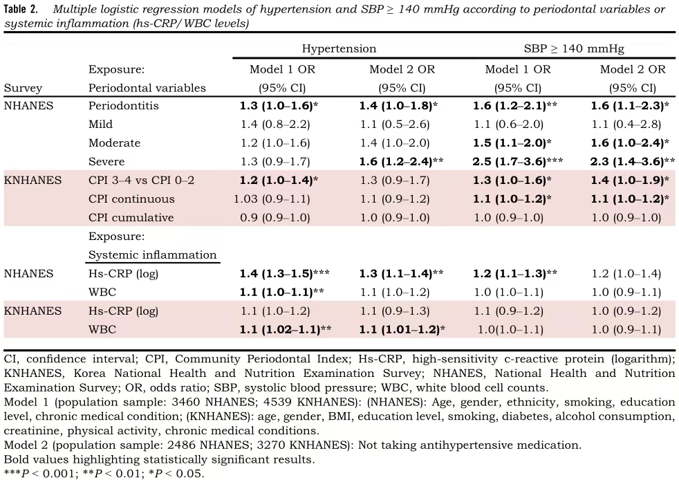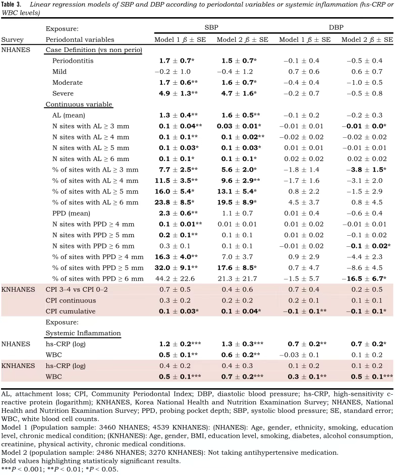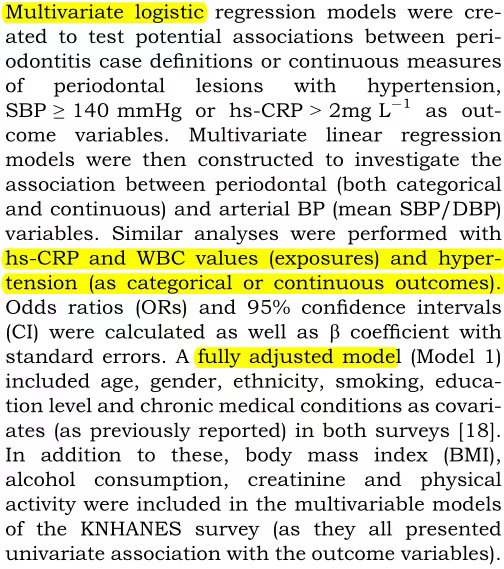 3.多因素回归分析,创建多变量logistics回归模型以测试牙周炎病例定义或牙周病变连续测量与高血压、SBP ≥ 140 mmHg 或 hs-CRP > 2mg/L 作为结果变量之间的潜在关联。然后构建多元线性回归模型来研究牙周(分类和连续)和动脉血压(平均收缩压/舒张压)变量之间的关联。对 hs-CRP 和 WBC 值(暴露)和高血压(作为分类或连续结果)进行了类似的分析。计算比值比 (OR) 和 95% 置信区间 (CI) 以及带标准误差的 bβ系数。完全校正的模型(模型 1)包括年龄、性别、种族、吸烟、教育水平和慢性疾病作为两项调查的协变量(如先前报道)。除此之外,KNHANES 调查的多变量模型还包括体重指数 (BMI)、饮酒量、肌酐和体力活动(因为它们都呈现出与结果变量的单变量关联)。