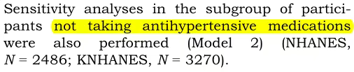 4.敏感性分析,对未服用抗高血压药物的参与者亚组进行了敏感性分析(模型 2)(NHANES,N = 2486;KNHANES,N = 3270)。